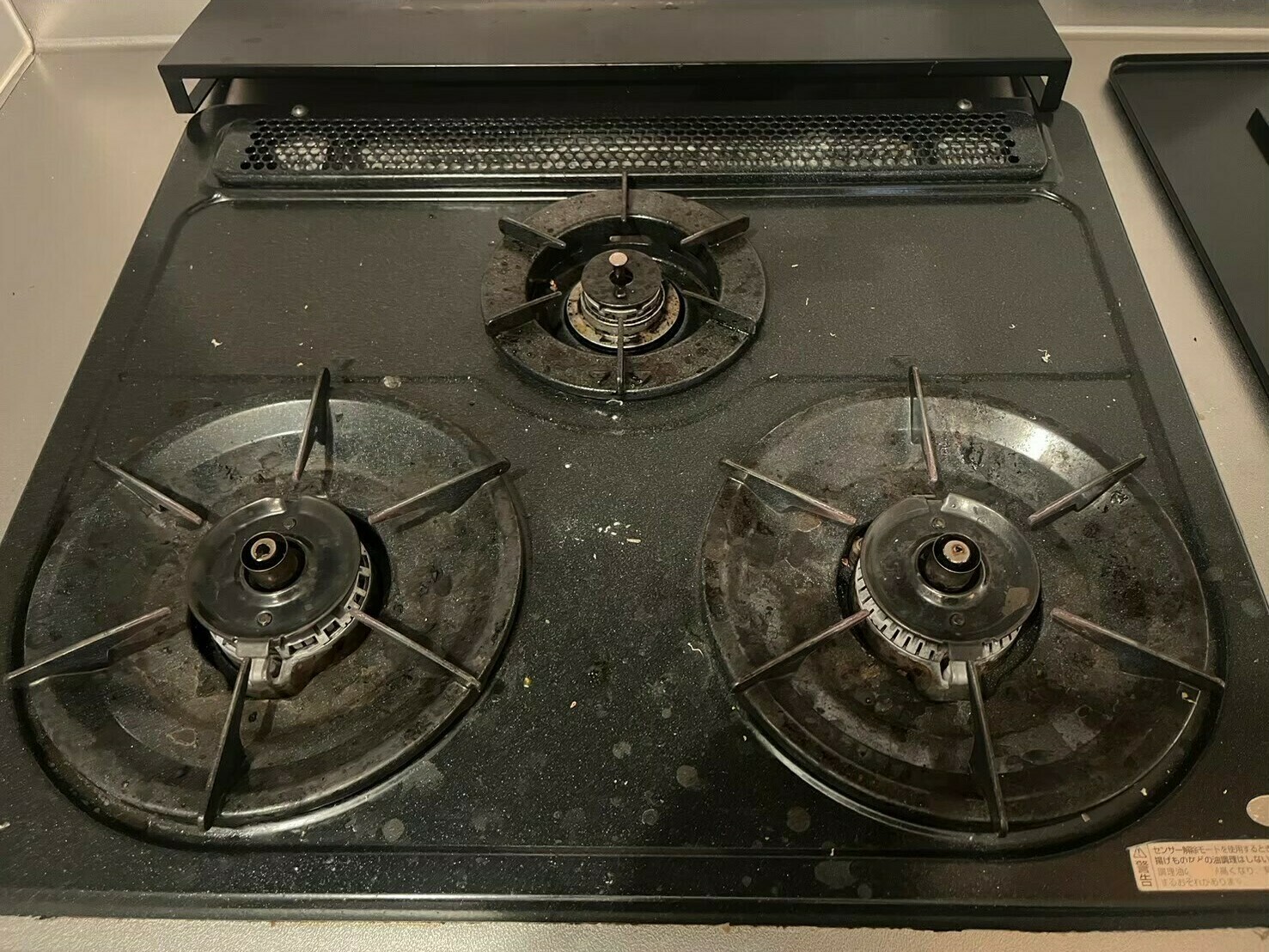 ガスコンロのガラストップには、吹きこぼし汚れや油汚れがあちらこちらについています💦