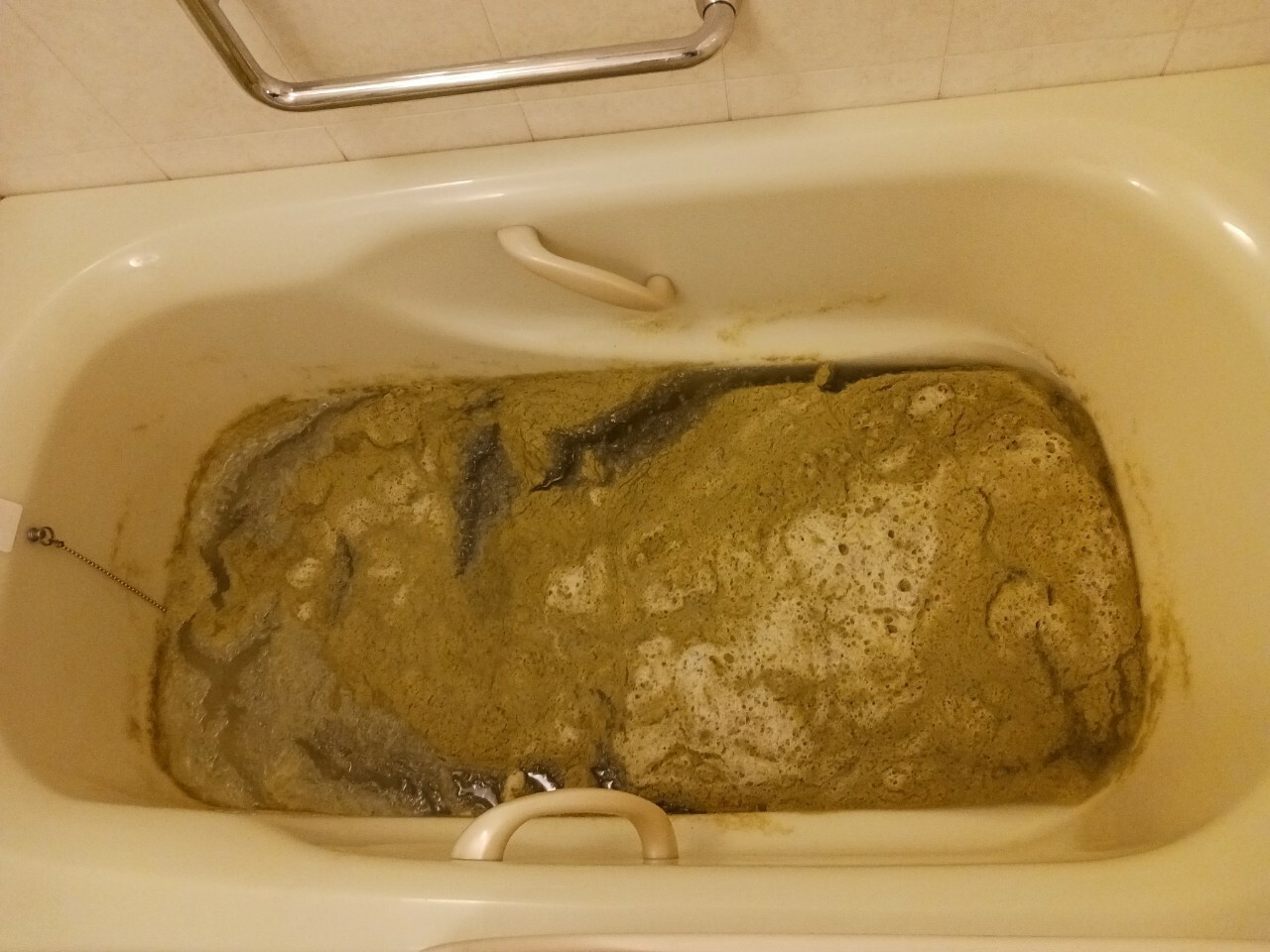 少し時間をおき、バスタブ内の汚水の変化があまり見られなくなり、汚れが完全に湧き出てこなくなったのを確認してから、バスタブ内に溜まった汚れとさよならします。