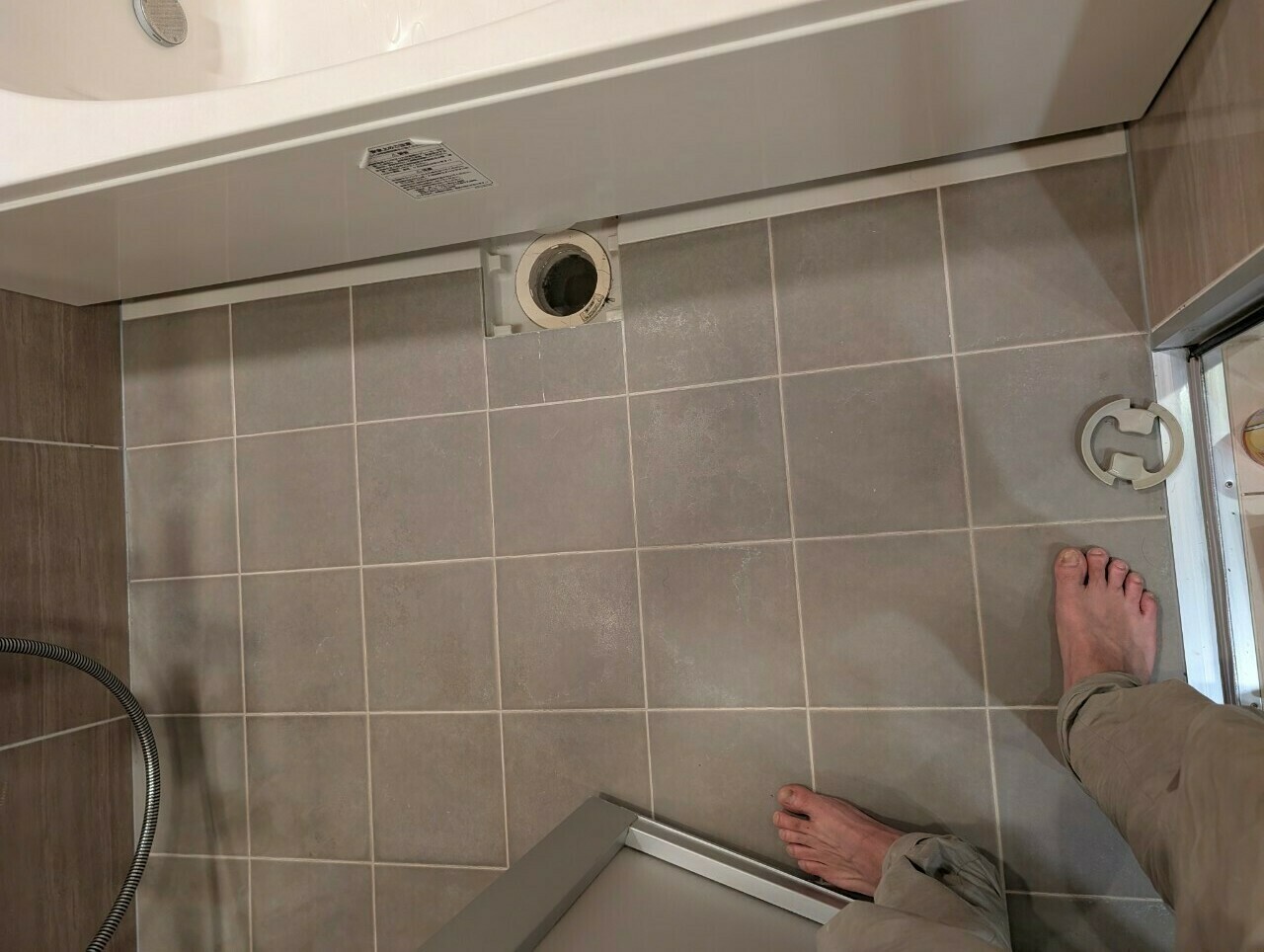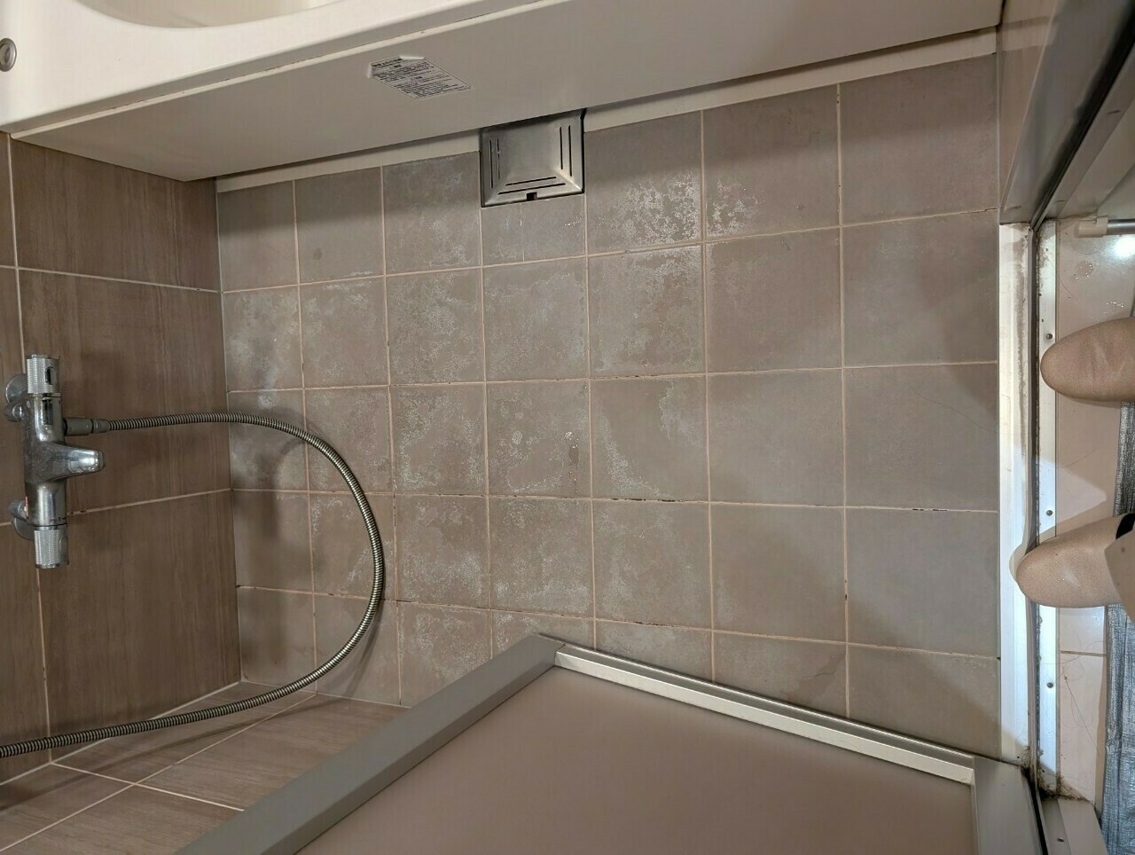 石鹼カス汚れや皮脂汚れの影響でもありますが、タイルの目地は黒カビ汚れがついています😵💫