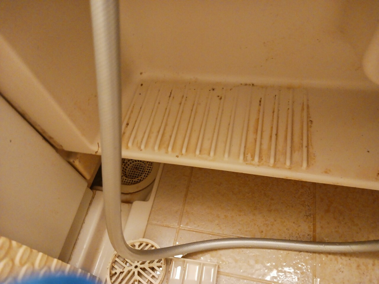 床のタイルのや目地には、黒カビ汚れや皮脂汚れがついていますね💦