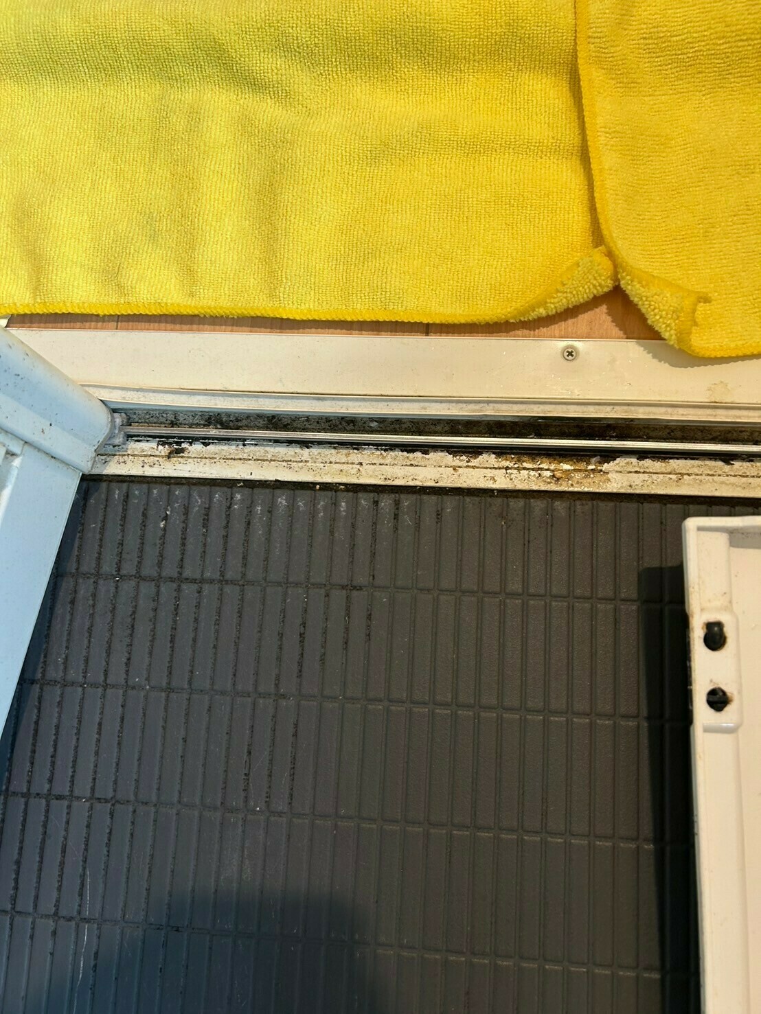 浴室の扉のサッシや床の目地には黒カビが詰まっていますね😵💫