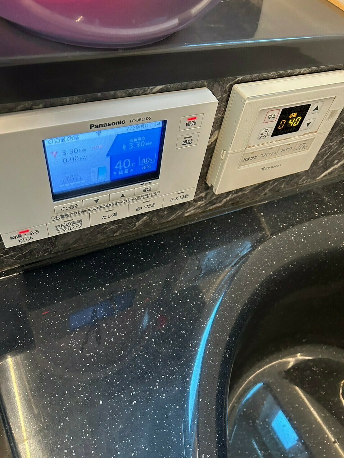 パネルの液晶画面部分が光っていてウロコ汚れがとれたかを確認できませんが…wパネルの操作ボタン部分の汚れが取れてきれいになったことが分かります😸