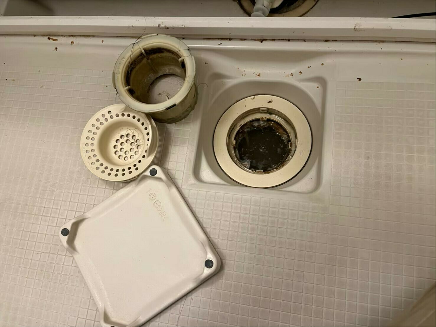 排水口の中は石鹼カス汚れや皮脂汚れがたまり、黒いぬめり汚れがついてしまっています😵💫